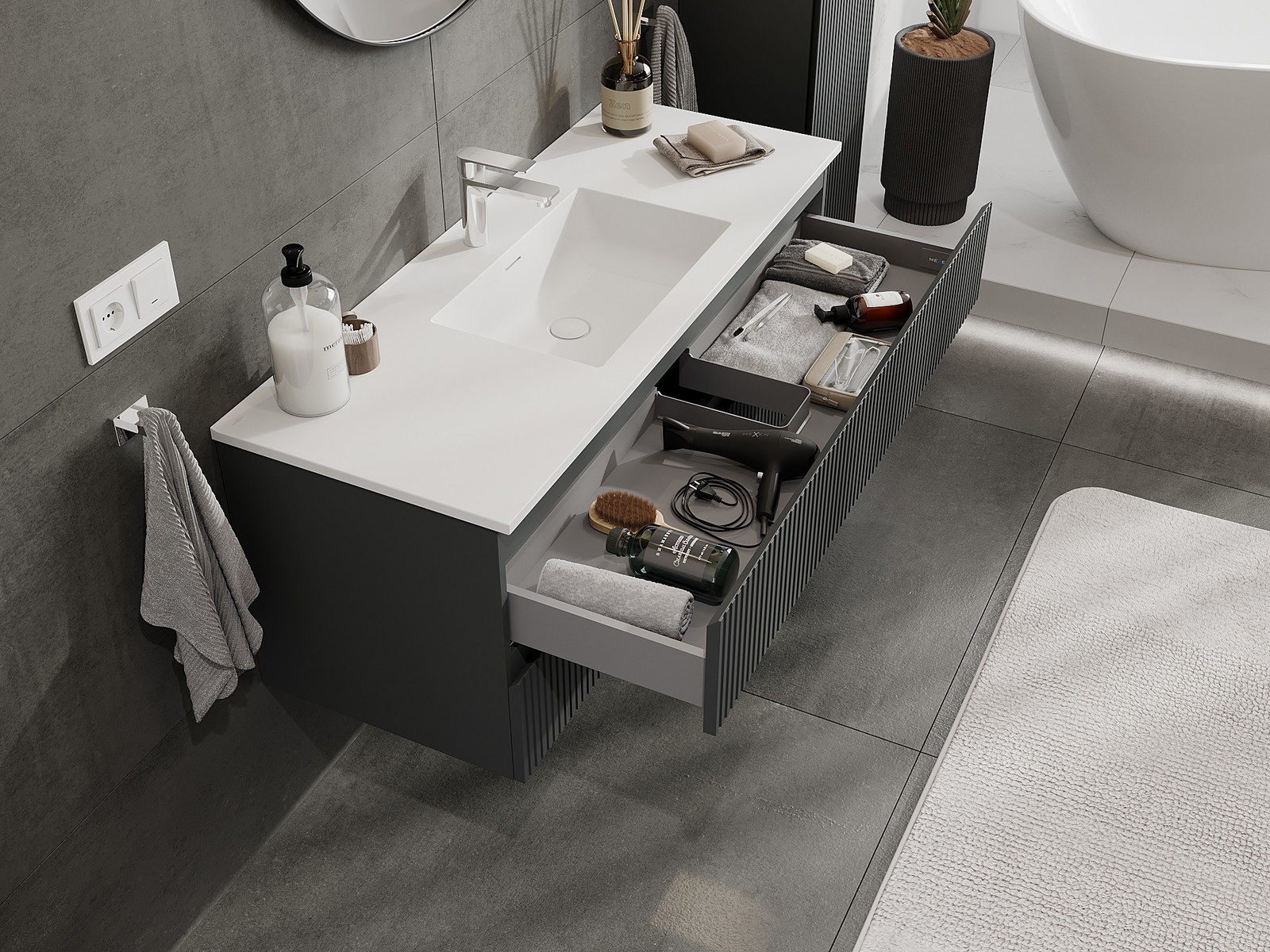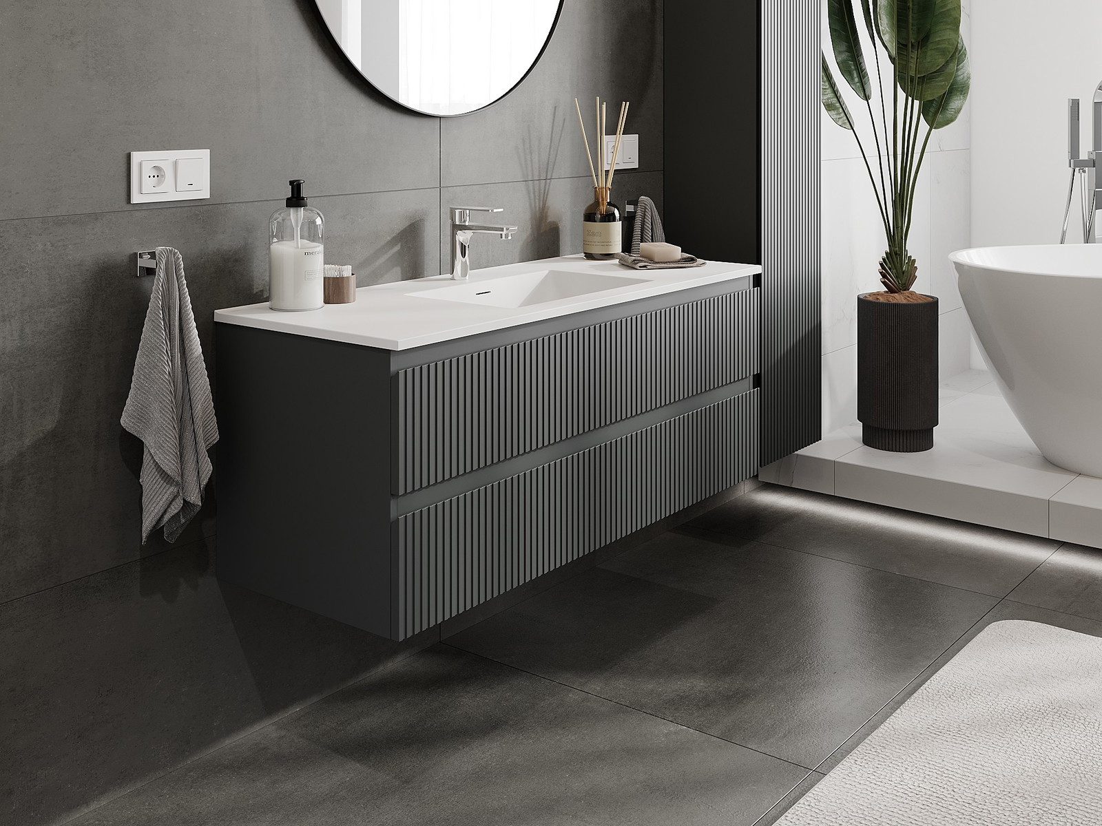 Mexen Rivel armário de casa de banho 120 cm com lavatório Otis, 2 gavetas, canelado, grafite mate/branco mate -