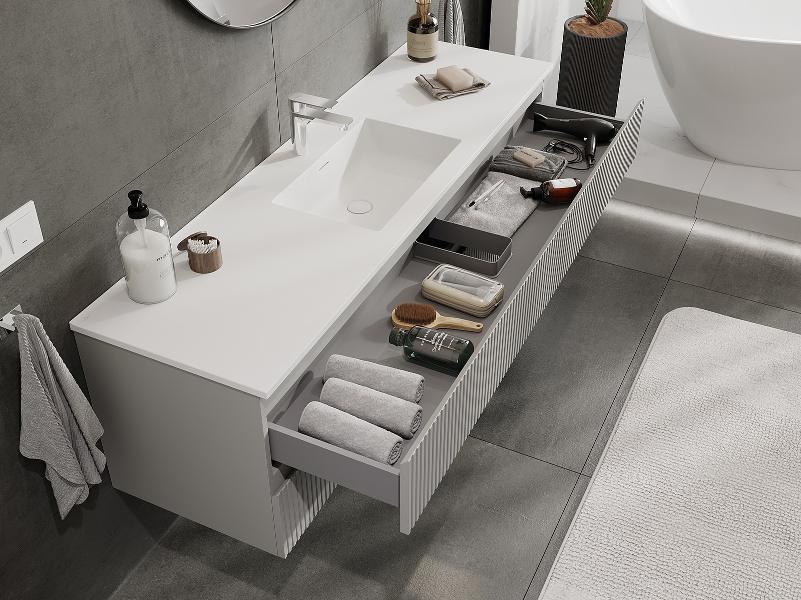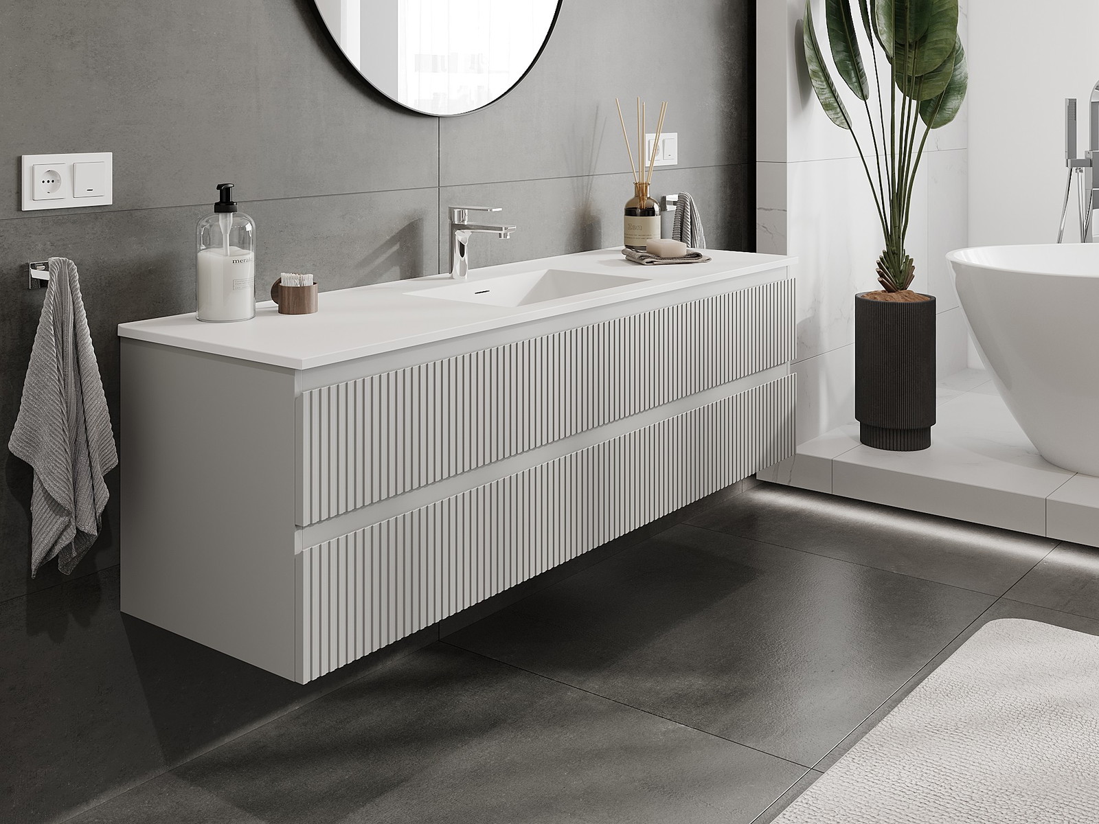Mexen Rivel armário de casa de banho 160 cm com lavatório Otis, 2 gavetas, frisado, cinza mate/branco mate -