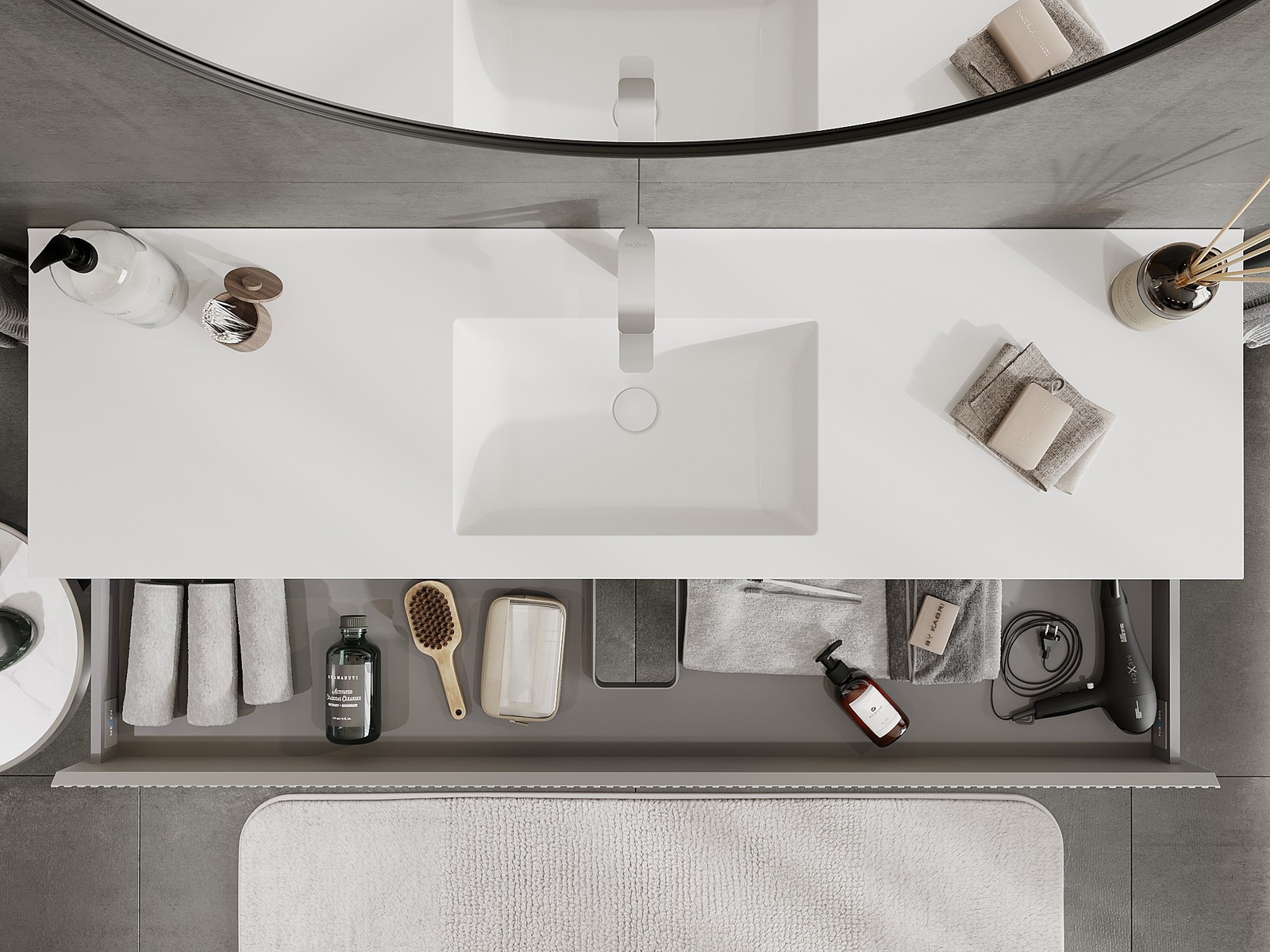 O recorte na gaveta é projetado de forma a acomodar o sifão, que é essencial em instalações de lavatórios. Graças a isso, o móvel pode ser montado de forma totalmente funcional, sem a necessidade de abdicar do espaço da gaveta em prol da instalação.
