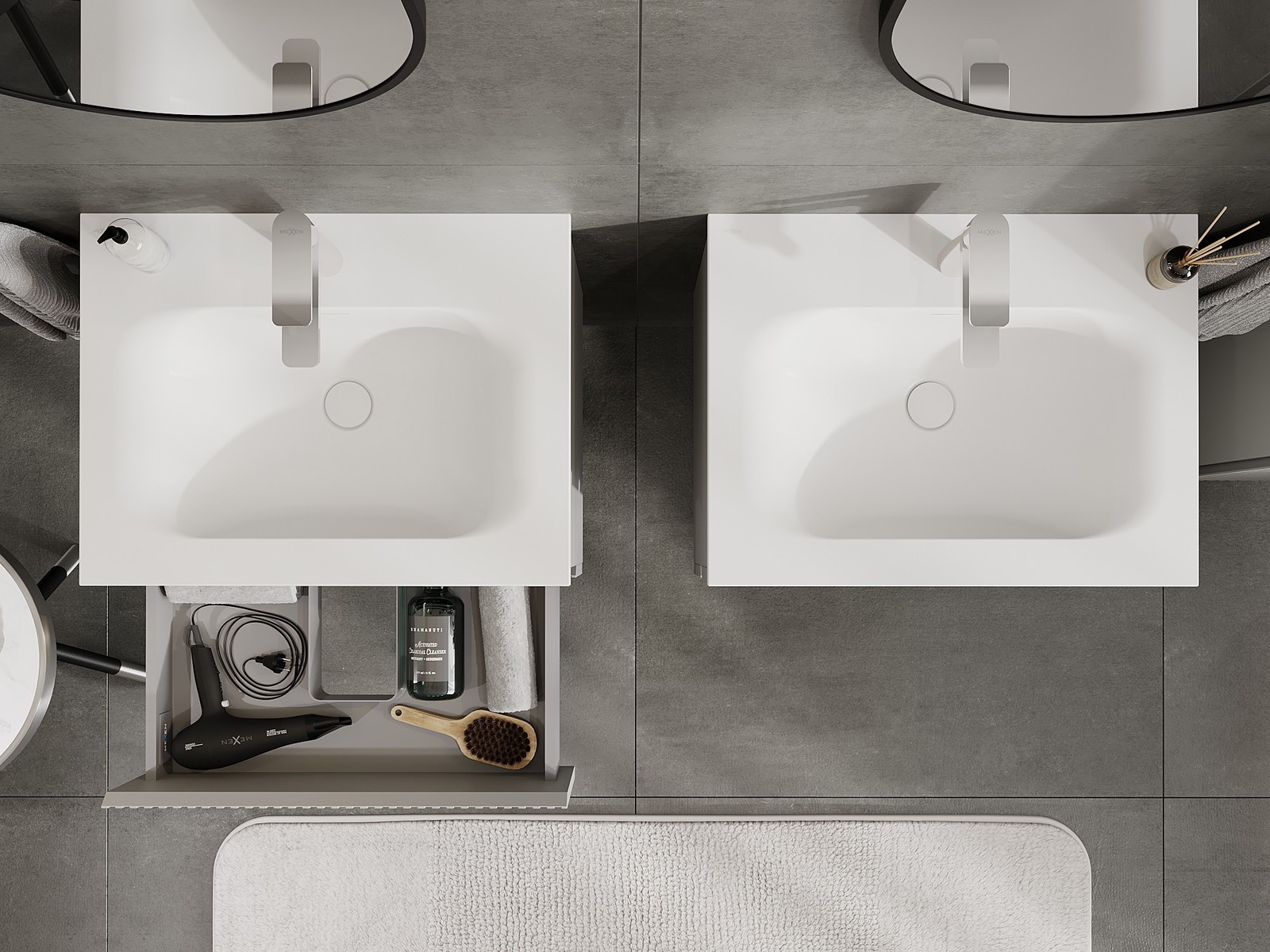 O recorte na gaveta é projetado de forma a acomodar o sifão, que é essencial em instalações de lavatórios. Graças a isso, o móvel pode ser montado de forma totalmente funcional, sem a necessidade de abdicar do espaço da gaveta em prol da instalação.