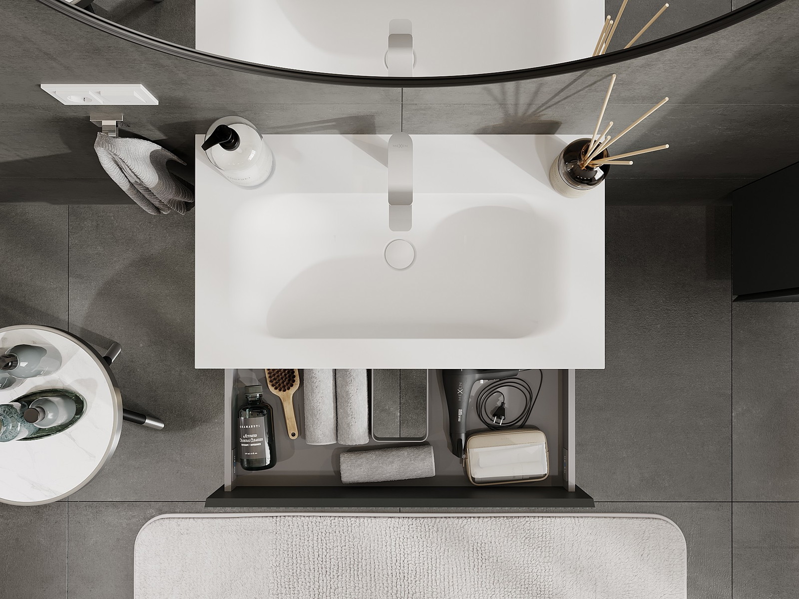 O recorte na gaveta é projetado de forma a acomodar o sifão, que é essencial em instalações de lavatórios. Graças a isso, o móvel pode ser montado de forma totalmente funcional, sem a necessidade de abdicar do espaço da gaveta em prol da instalação.