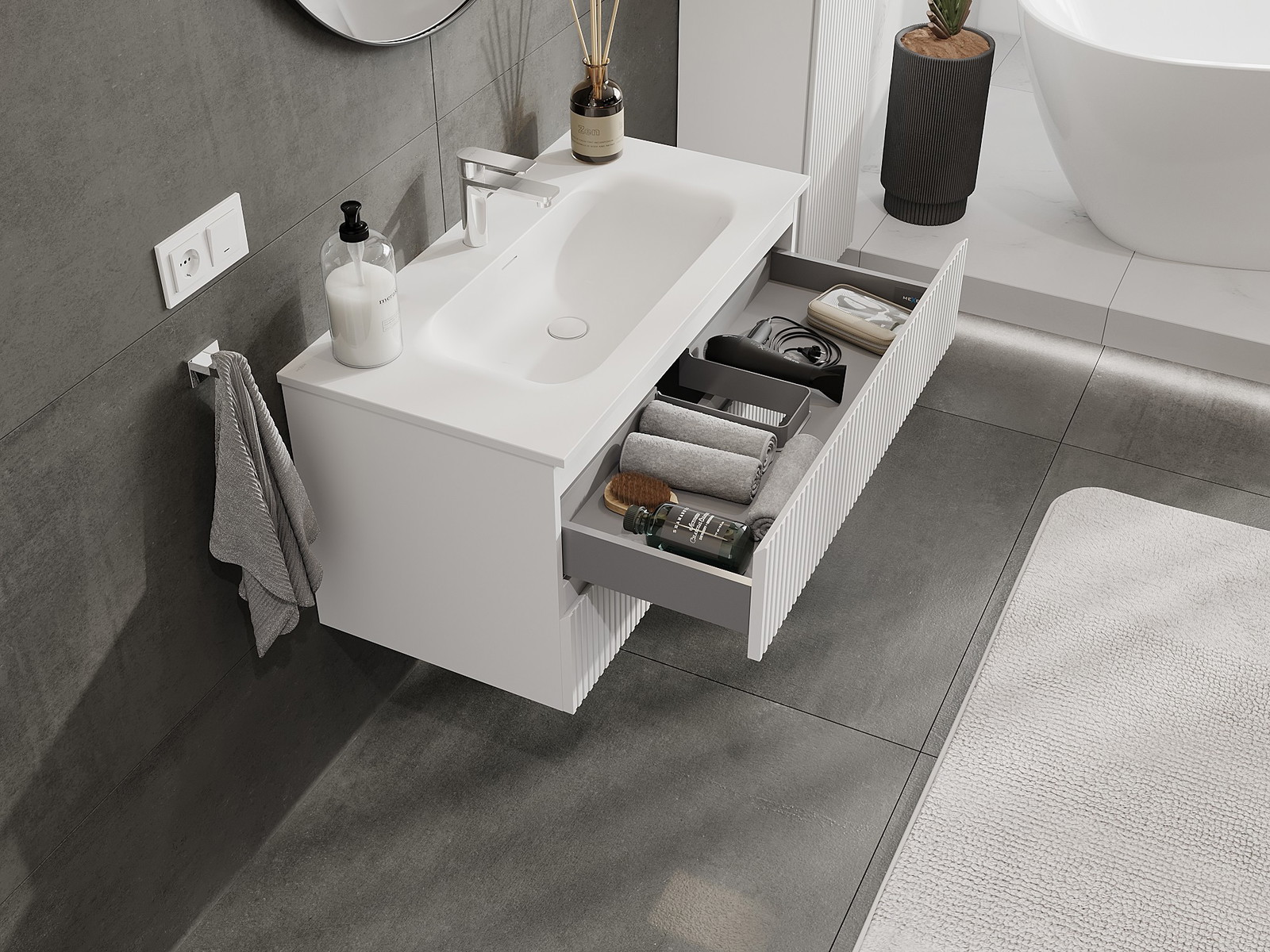 O recorte na gaveta é projetado de forma a acomodar o sifão, que é essencial em instalações de lavatórios. Graças a isso, o móvel pode ser montado de forma totalmente funcional, sem a necessidade de abdicar do espaço da gaveta em prol da instalação.