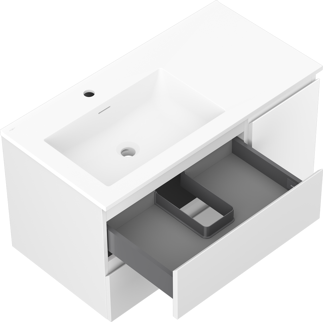 O recorte na gaveta é projetado de forma a acomodar o sifão, que é essencial em instalações de lavatórios. Graças a isso, o móvel pode ser montado de forma totalmente funcional, sem a necessidade de abdicar do espaço da gaveta em prol da instalação.