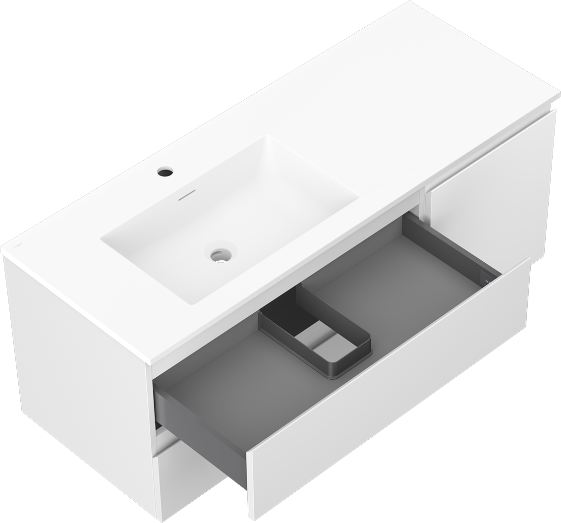 O recorte na gaveta é projetado de forma a acomodar o sifão, que é essencial em instalações de lavatórios. Graças a isso, o móvel pode ser montado de forma totalmente funcional, sem a necessidade de abdicar do espaço da gaveta em prol da instalação.