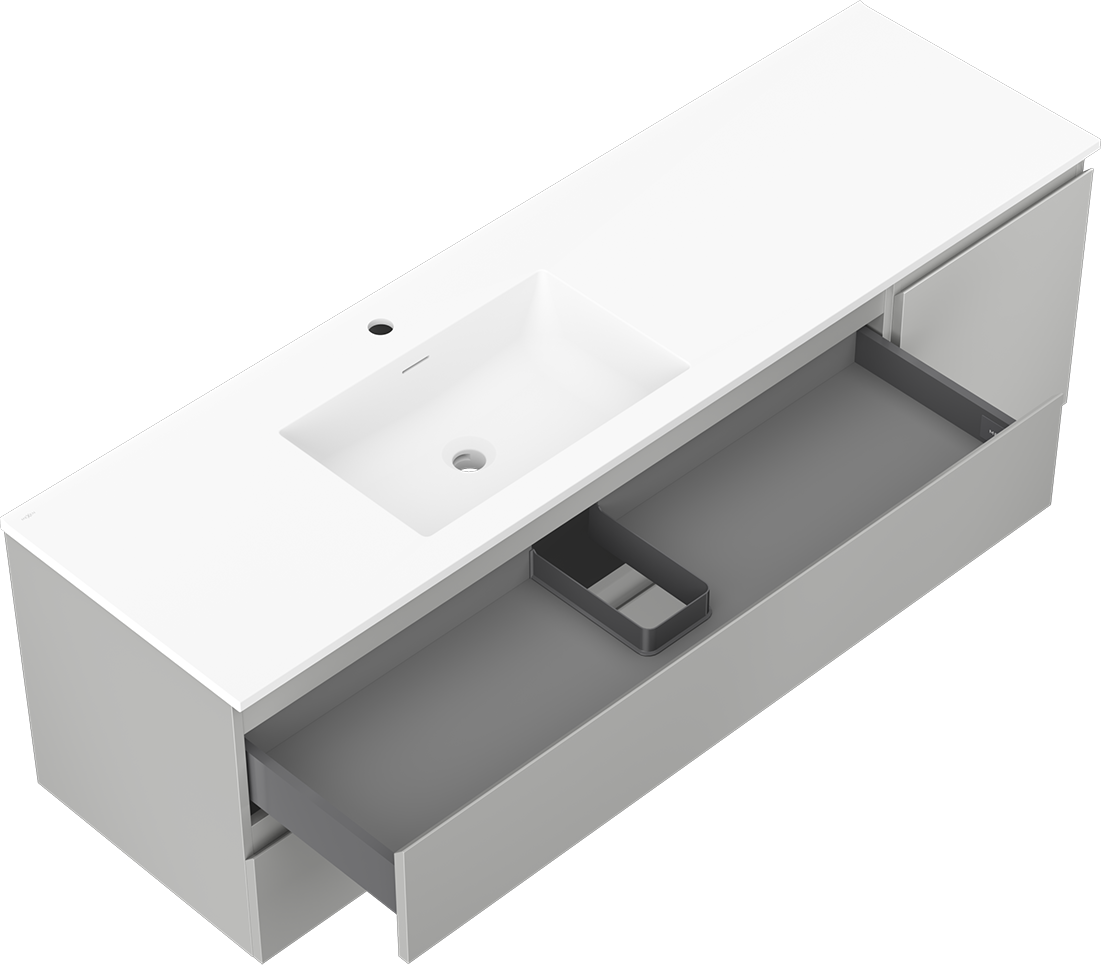 O recorte na gaveta é projetado de forma a acomodar o sifão, que é essencial em instalações de lavatórios. Graças a isso, o móvel pode ser montado de forma totalmente funcional, sem a necessidade de abdicar do espaço da gaveta em prol da instalação.