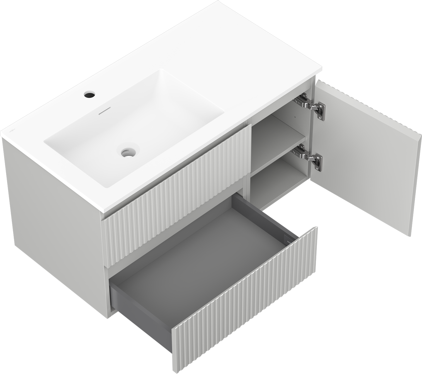 Mexen Rivel armário de casa de banho 90 cm com lavatório Otis esquerdo, 2S, 1D, ranhurado, cinza mate/branco mate