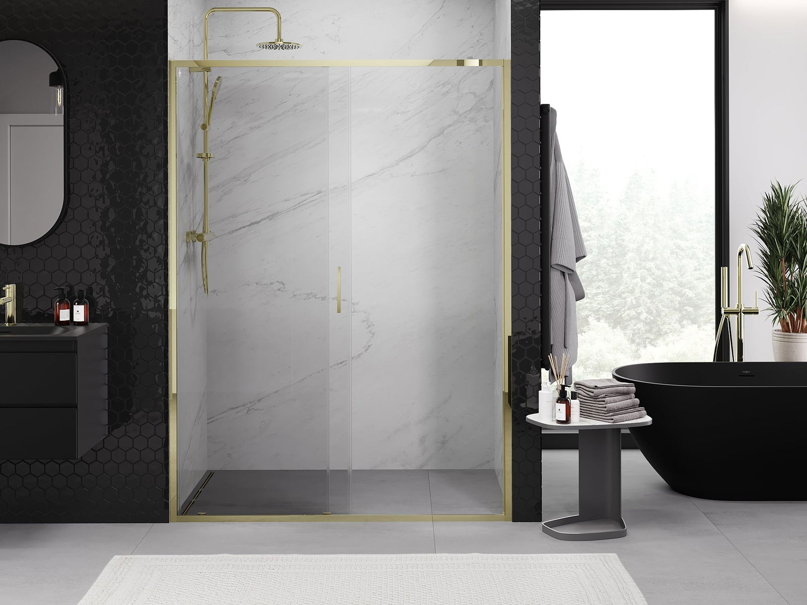A pega prática e confortável foi feita de metal durável e resistente. A forma moderna combinada com o acabamento ajustado à cor dos perfis confere a todo o conjunto uma aparência moderna e estilosa, realçando a estética de qualquer casa de banho.