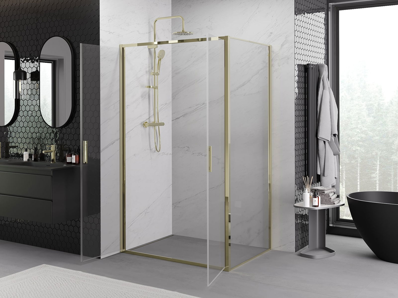 A pega prática e confortável foi feita de metal durável e resistente. A forma moderna combinada com o acabamento ajustado à cor dos perfis confere a todo o conjunto uma aparência moderna e estilosa, realçando a estética de qualquer casa de banho.