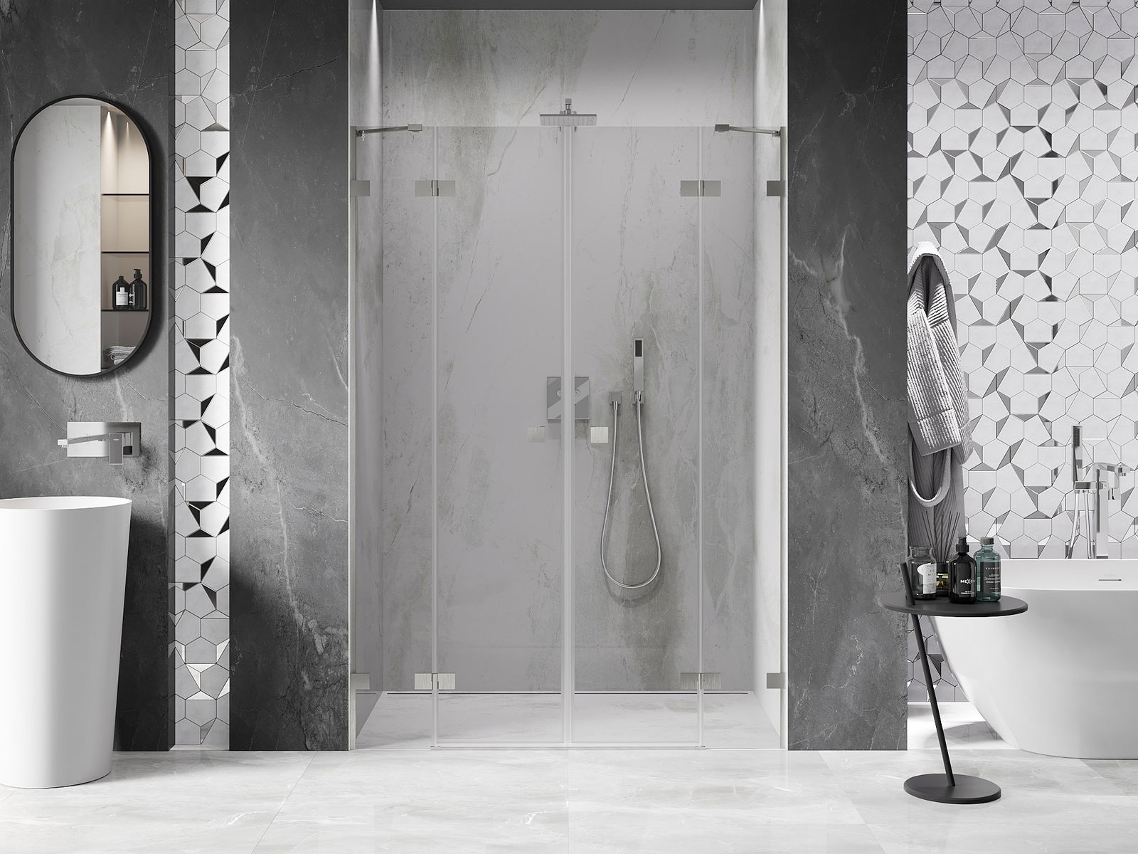 A pega prática e confortável foi feita de metal durável e resistente. A forma moderna combinada com o acabamento ajustado à cor dos perfis confere a todo o conjunto uma aparência moderna e estilosa, realçando a estética de qualquer casa de banho.