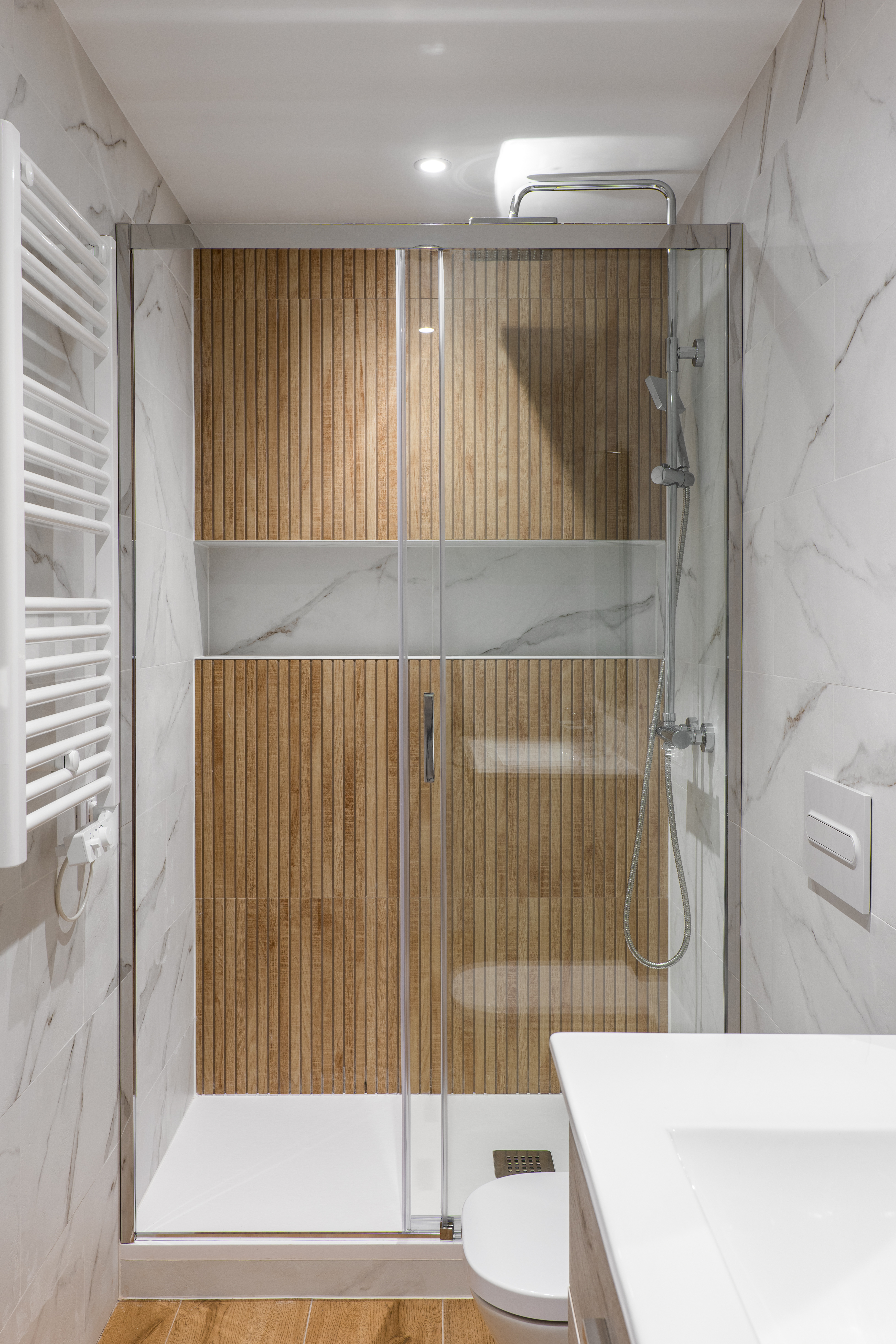 Por fora, acima do reboco, encontra-se apenas o chuveiro de mão, a cabeça de chuveiro e o torneira. Todo o conjunto de duche, composto pela estrutura embutida com os elementos necessários, está escondido na parede. Isso permite decorar uma casa de banho pequena de maneira elegante, sem a necessidade de instalar uma cabine grande.