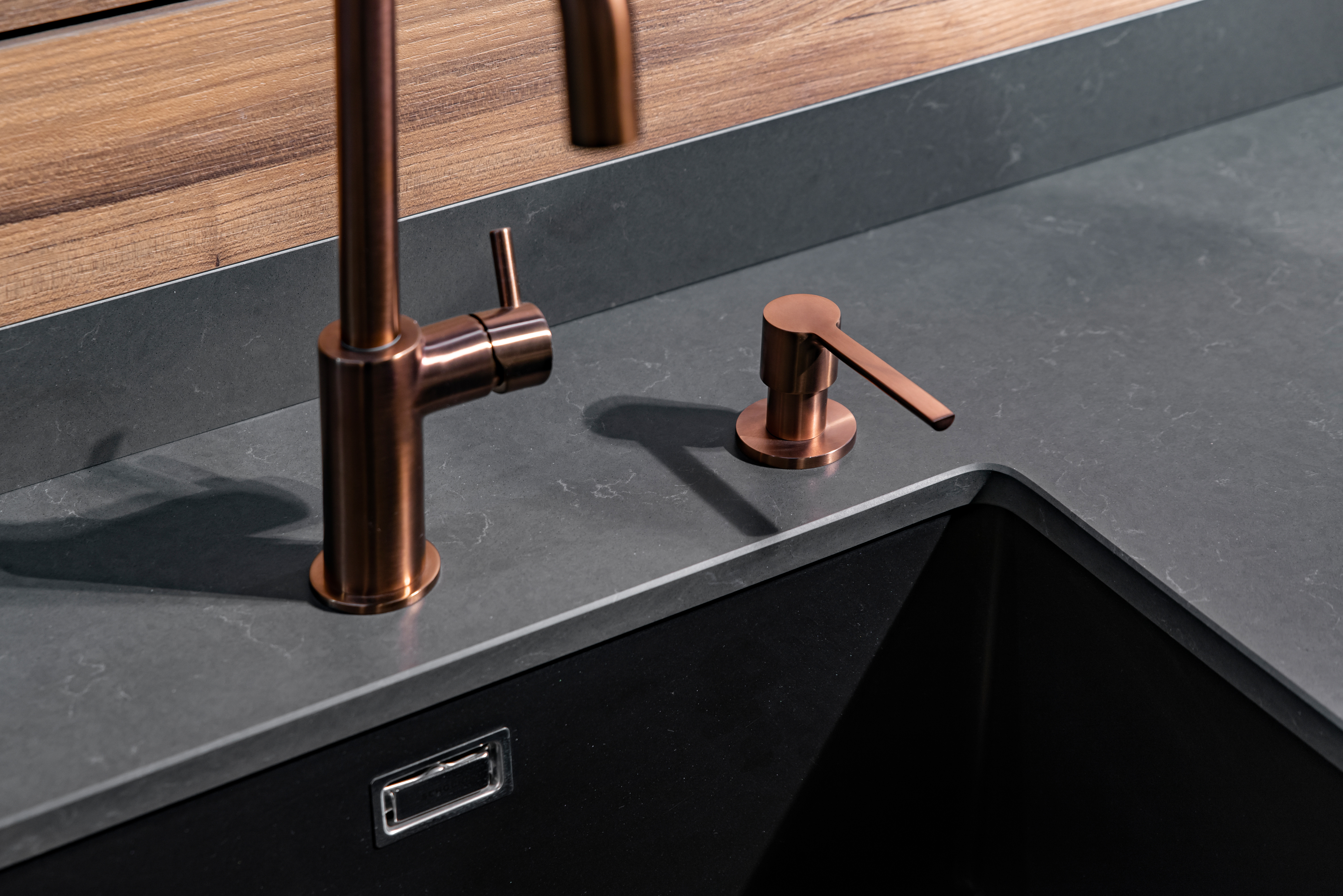 Na maioria das vezes, todos os detergentes de cozinha são colocados na borda da bancada ou no escorredor, estão à mão, mas não é uma solução particularmente conveniente, nem estética. Muito pelo contrário, as garrafas de plástico coloridas podem trazer caos para a cozinha, e durante movimentos vigorosos é possível derrubar as garrafinhas no chão, sem falar que por distração podes colocá-las em um lugar completamente diferente. Para evitar essas situações, é mais fácil comprar uma pia de granito equipada com dispensadores adequados para ela.