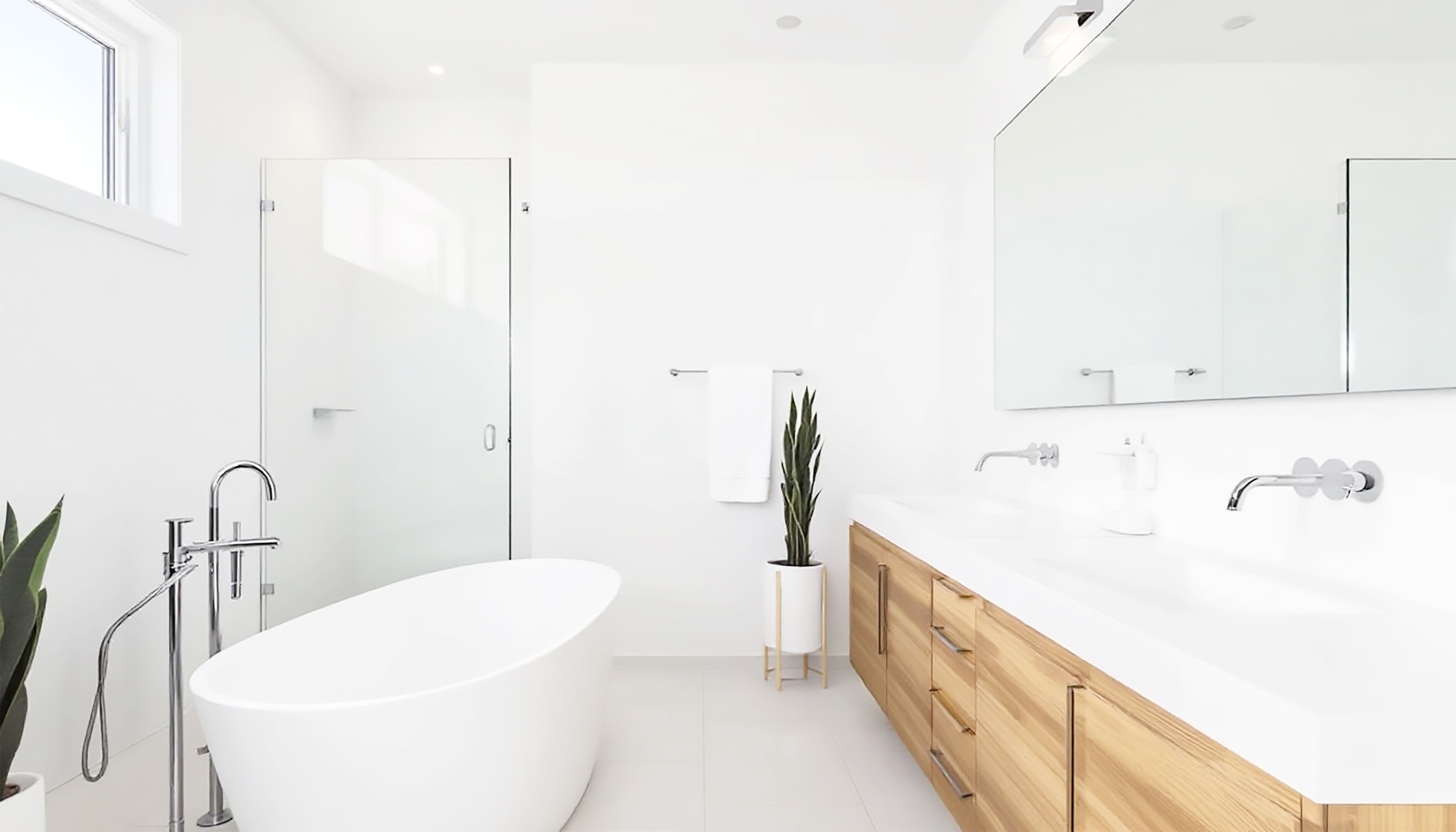 Estilo modernista — uma casa de banho clara moderna combina formas simples, acessórios minimalistas e formas geométricas. Cores claras podem ser complementadas com acentos naturais como madeira e pedra, além de torneiras contrastantes. Espelhos grandes, que destacam a modernidade e ampliam o espaço, também funcionam bem.