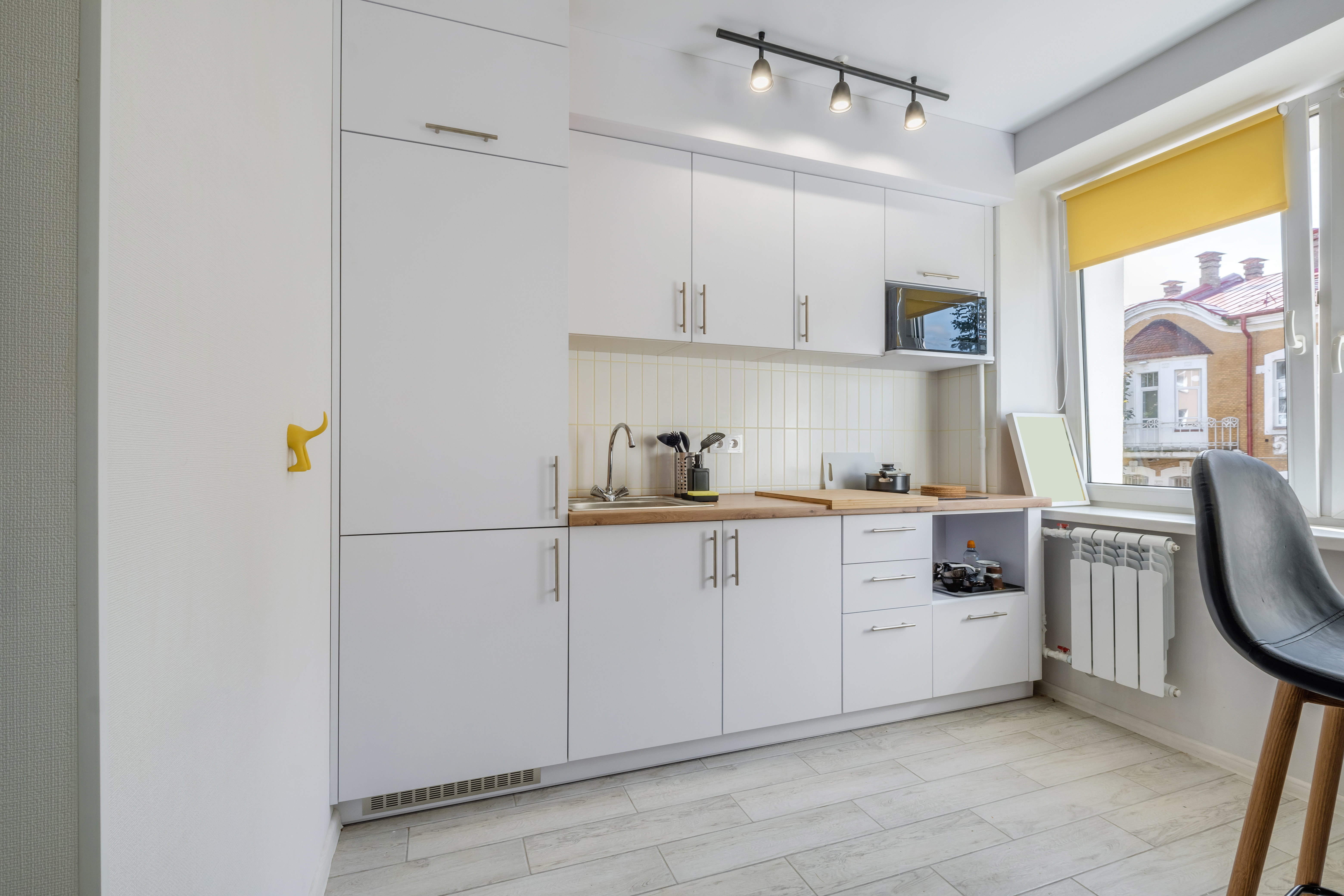 Uma pequena cozinha deve ser equipada, acima de tudo, de forma funcional - a ergonomia é muito importante aqui. Mesmo que praticamente não laves à mão, e no dia a dia uses principalmente a máquina de lavar louça, deves ter pelo menos um mini lava-loiça na cozinha. Servirá para um rápido enxaguamento das mãos ou para lavar uma única caneca após o chá. Um pequeno lava-loiça de cozinha pode estar equipado com um escorredor, onde vais colocar a louça molhada. Uma ideia interessante é também um lava-loiça equipado com uma cuba adicional com um escoadouro separado, que assumirá a função de escorredor, permitindo assim economizar algum espaço na bancada.